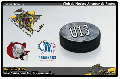 Une fois n'est pas coutume, pour les Benjamins rouennais, la soupe à la grimace aura été servi dans un bol bien chaud pour Rouen (1) et Rouen (2) respectivement opposés à Amiens (1) et Caen (1) Jusqu'alors invaincus en championnat avec trois victoires et un match nul face à Amiens (2), les oppositions face à la Picardie ne sont pas au goût des Dragons de Rouen (1) qui n'auront pas réussi à maintenir leur suprématie sur leur glaçon de l'Ile Lacroix. Pourtant, le chassé-croisé au tableau d'affichage entre les deux équipes aura été intense. En effet, après une première période concédée par les dragons à leurs adversaires (1-2), la deuxième période permettait aux rouennais de revenir à parité puis de passer devant à 3-2 jusqu'à la deuxième sirène. Toutefois en dépit d'une belle bataille sur la glace, le hockey sur glace est un sport qui se joue en trois tiers-temps et celui de cette rencontre tournera largement à l'avantage de la formation amiénoise. Au coude à coude durant deux périodes, le troisième tiers sera fatal à des Dragons qui subiront le courroux amiénois par trois fois pour s'incliner à l'issue du match sur le score de 5-3.