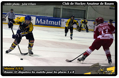 Suite du tournoi U15 « Romain Montagnac » avec le point à la pause « Noël des Dragons » Tandis que le Rouen Hockey Elite 76 et sa horde de fans fêtera Noël, le tournoi minime fait relâche avant de reprendre à 17h30 avec le dernier match de la Poule B.