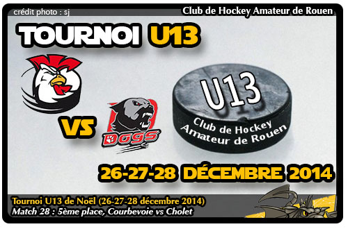 Après avoir espéré se qualifier en demi-finale jusqu'aux dernières minutes de la phase de classement au sein de la Poule B, c'est finalement le match de la 5ème place que les Coqs de Courbevoie disputeront face aux Choletais. Déjà opposés lors de la phase de poule avec une victoire des parisiens 3 buts à 1, cette fois les deux équipes sommeillaient doucement sur le glaçon rouennais. Pas forcément enclin à se ruer à l'offensive, les minutes défileront sans que les deux gardiens n'aient de l'ouvrage outre mesure.