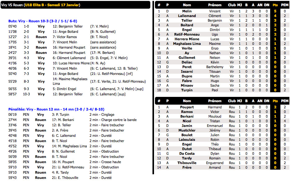 Vainqueurs dernièrement par deux fois face à Amiens 2 et face au Pole France Féminin, le tout sur l'Ile Lacroix, les Dragons de l'Elite B en déplacement à Viry auront connu, certes, moins de réussite, mais auront néanmoins tenu l'espace de quarante minutes chez un des gros bras de l'Elite B, les parisiens occupant la place de dauphin du leader gapençais. Dans un contexte un soupçon délicat avec un effectif pour le moins réduit entre les blessés, absents et matchs U15, les rouennais souffraient d'entrée de jeu. Rapidement détachés au score après deux buts paraphés par Benjamin Tellier (05'40) et Ange Boitard (11'08), les rouennais trouveront la ressource pour venir au score par Victor Ramos, réconcilié avec ses mains qui pouvait afficher un large sourire au moment de rentrer au banc après le 2-1 (18'42) Si avant la première sirène, Viry-Châtillon reprenait sa marche en avant par Vincent Melin (17'05), il trouvait en réponse le but d'Harmand Poupart (18'41) pour la clôture du score de la première manche à 3-2.