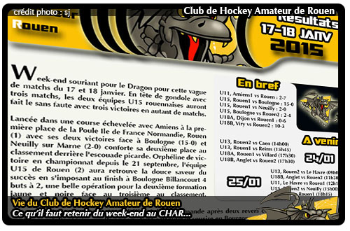 Enfin belle affaire dans le cadre du championnat interconférence pour les U11 en déplacement à la patinoire d'Amiens. Dans une poule A où ils auront remporté un premier succès face à Meudon (11-0), Rouen (1), pour son deuxième match dans ce championnat qui confronte les ligues de Normandie – Picardie et Ile de France, aura effectué une belle opération en prenant les points de la victoire (7-2) Deux victoires en deux matchs pour les U11 en interconférence avant leurs prochains rendez-vous face à Viry et Neuilly-sur-Marne. » (résumé)