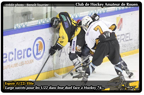 Qualifiés pour la Finale du championnat de France U22 Elite, les rouennais retrouveront un « vieil habitué des finales » Amiens qui se sera débarrassé d'Anglet sans trop sourciller. Intouchables ou presque en saison régulière, Amiens après un large succès en quart de finale face à Villard, récidivera en demi-finale face aux basques d'Anglet. Plantant le décor lors de la première période de la première manche avec un cinglant 4-0, c'est sur le score de 6 buts à 2 que les amiénois remporteront la première manche. Un écart de quatre buts que l'on retrouvera également sur la deuxième rencontre, toujours à l'avantage des picards qui attendront la troisième période pour creuser l'écart. A 2-3 à la faveur d'Anglet à dix minutes de la fin, une violente réaction épidermique des amiénois leur permettra de planter cinq buts retournant complètement la rencontre pour une victoire finale amiénoise 7 buts à 3. Rouen et Amiens se retrouveront donc en finale dimanche 22 et lundi 23 février dans un contexte un peu particulier côté picard puisque la semaine sera bien agitée pour une bonne partie de l'équipe espoir avec plusieurs joueurs majeurs appelés à jouer en Ligue Magnus, mardi et mercredi à Amiens face à Morzine-Avoriaz et vendredi voire samedi en Haute-Savoie, pas idéal pour préparer une finale U22.