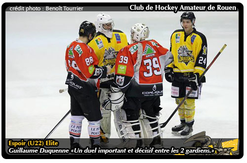 Anecdote dans l'histoire, dans le filet amiénois c'est un ancien rouennais Guillaume Duquenne (champion de France U15 avec Rouen en 2008, U18 en 2010 et 2011 et U22 en 2013) qui retrouvera ses anciens amis pour les défier en finale « J'aimerais bien dire que ça sera une finale normale comme toutes les autres. Sauf que jouer contre l'un de ses anciens clubs et ses amis cela fait beaucoup d'émotions. Mais voilà ses émotions resteront à la maison. Car ça reste le derby et une finale. Ensuite étant dans ma dernière année junior, je donnerais tout pour finir sur un titre. On dit souvent que le gardien est important dans une équipe, mais bon il ne va pas marquer les buts. Chacun est important, chacun a son rôle dans une équipe. En revanche vu les calibres de chaque équipe cela promet une très belle finale et donc un duel important et décisif entre les 2 gardiens. » soulignera l'ex portier rouennais qui aura en face de lui soit Quentin Papillon, soit Tom Aubrun « Sur le papier, nous aurons deux gros matchs à jouer, nous avons les qualités pour être champion même si Amiens à l'expérience des finales de l'année dernière avec une très grosse équipe où la moitié des joueurs jouent en équipe de France. Guillaume dans les buts d'Amiens est un atout pour eux, c'est un gardien très bon techniquement qui avait sorti deux gros matchs contre nous lors de la saison régulière » rappelle Tom Aubrun qui aura plaisir de retrouver son ancien colocataire sur la glace « Cela risque d'être une finale assez compliquée pour nous même si nous avons l'avantage de la glace pour jouer devant notre public. Même si Amiens en Ligue Magnus aura tout fait pour finir en trois matchs et arriver frais, cette semaine n'aura pas été de tout repos » de conclure Guillaume Duquenne en rappelant une heureuse problématique amiénoise, celle de ses Espoirs majoritairement et fortement intégrés et indispensables à l'équipe de Ligue Magnus. Une problématique que Rouen n'a pas... Malheureusement.