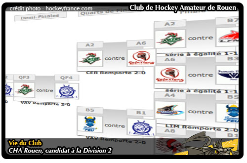 En collaboration et avec le soutien du Rouen Hockey Elite 76, le CHA Rouen pourrait, en cas de dossier jugé recevable par la Fédération Française de Hockey sur Glace, se voir versé dans la Poule A de la prochaine édition de la Division 2 aux cotés de Toulouse-Blagnac, Meudon-la-Forêt, Annecy, les Français Volants, Clermont-Ferrand, Valence, Roanne, Strasbourg 2 et Avignon. Chambéry, Cergy-Pontoise, Limoges, Amnéville, Villard-de-Lans, Asnières, Boulogne-Billancourt, Evry/Viry, Wasquehal et Marseille composant l'autre poule.