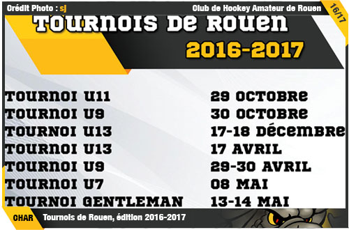 Moments clefs de chaque saison sportive pour les différentes catégories du Club de Hockey Amateur de Rouen, les tournois disputés sur l'Ile Lacroix seront bien évidemment au rendez-vous de cette saison 2016-2017. Vous trouverez ci-dessous la liste des tournois organisés sur les bords de Seine pour la prochaine saison.