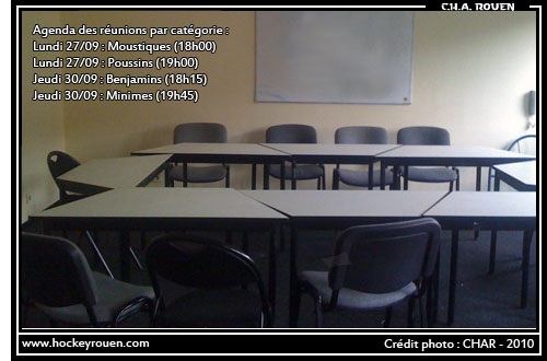 Si l'essentiel de la saison des vos enfants se passent sur la glace au gré des entraînements et des matchs, la vie du club et des différentes catégories ne se limite pas au seul glaçon. C'est pourquoi à l'instar de l'année dernière, le Club de Hockey Amateur de Rouen par l'intermédiaire de son directeur sportif Peter Almasy a mis en place plusieurs réunions par catégorie destinées aux parents afin que chacun connaisse au mieux le fonctionnement de sa catégorie dans tous les domaines (sportif, organisationnel, financier etc...) A ce jour, les catégories moustiques, poussins, benjamins et minimes sont concernées par deux dates : le lundi 27 septembre et le jeudi 30 septembre.