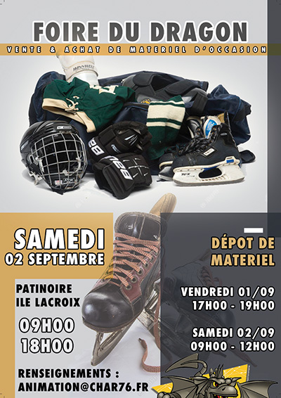 Samedi 02 septembre 2017 : Foire du Dragon (cliquez ici) De l'équipement de hockey sur glace à vendre ? du matériel d'occasion à acheter ? Le Club de Hockey Amateur de Rouen organise une vente de matériel d'occasion à la patinoire de l'Ile Lacroix le samedi 02 septembre (dépot du matériel à vendre : vendredi 01 septembre de 17h00 à 19h00 & samedi 02 septembre de 09h00 à 12h00 au foyer de la patinoire) |