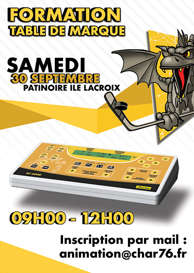 Samedi 30 septembre 2017 : Formation Table de Marque (cliquez ici) Sans table de marque, pas de match ! Le Club de Hockey Amateur de Rouen vous propose une formation gratuite table de marque le samedi 30 septembre de 09h00 à 12h00. Maillon essentiel dans l'organisation des matchs, rejoignez le bocal pour la prochaine saison du Dragon ! |