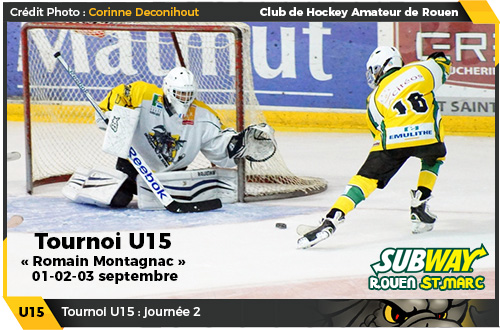 Après une première journée où les Dragons de Rouen (1) se seront taillés la part du lion (lire par ailleurs), la deuxième journée du Tournoi U15 « Romain Montagnac » aura donné lieu à un duel à distance entre Caen et Rouen (1), l'association parisienne Evry / Viry se faufilant à la troisième place devant le train des poursuivants emmené par Rouen (3), Rouen (2) et Strasbourg.