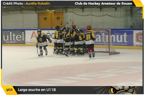 Si les résultats ne suivent pas toujours, une chose est sure c'est que l'équipe U11B jaune et noir ne lâche jamais les rencontres et qu'à chaque fois c'est avec un bel état d'esprit que les jeunes Dragons grimpent sur la glace pour défendre les précieuses couleurs « jaune et noir » Une enthousiaste débauche d'énergie qui jusqu'alors n'avait encore été récompensée par une victoire, les normands restant sur trois défaites face à Caen (2) par deux fois et Le Havre. C'est désormais chose faite pour les rouennais qui auront décroché leur premier succès de la saison, qui plus est avec la manière, au terme d'une belle partie jouée face à l'association Cléon / Louviers.