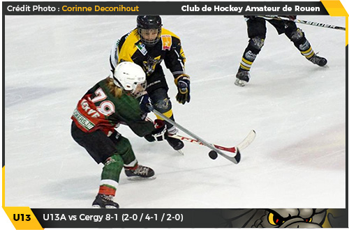 Forte de son succès la semaine dernière face à Evry / Viry 5 buts à 2, l'équipe U13 jaune et noir avait l'occasion de poursuivre sa remontée au classement de l'interconférence A avec la réception des Jokers de Cergy.
