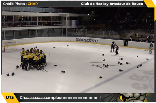 Il était écrit que dans cette finale, au bout du suspense, on irait tant la marge entre les deux équipes étaient faible, l'écart imperceptible, la différence discrete et les deux équipes méritantes. C'est en prolongation que l'affaire se poursuivait après une dernière salve d'occasions de part et d'autres. A 3 contre 3 sur grande glace, les occasions seront légions, les frissons également, les deux camps ayant tour à tour l'opportunité d'en finir notamment en supériorité numérique sur la fin de match pour Hockey 74. Mais là encore, aucun Dragon, aucun ne voulait se résoudre à s'incliner et c'est en jetant tête la première sur chaque palet qu'ils parviendront à rallier la fin de cette prolongation sans subir une cruelle désillusion. Il fallait désormais s'en remettre à la terrible séance de tirs aux buts pour déterminer le vainqueur. Un ultime suspense, une ultime empoignable... Une dernière salve pour les gardiens qui devaient faire face aux meilleurs artilleurs de la saison . Une première tentative manquée du coté des Dragons, même sort pour Hockey 74. Sur la deuxième vague, Théo Quitteville parvenait à marquer alors que le tireur haut-savoyard manquait la sienne. Troisième tentative pour Rouen qui ne parvenait pas à tuer le match et une dernière chance pour Pierre Tollet qui devait absolument vaincre Paul Caput pour entretenir l'espoir.... Gigantesque explosion de joie sur le banc jaune et noir au moment où le portier rouennais faisait l'arrêt offrant aux Dragons le neuvième titre de leur histoire en U15 !!!