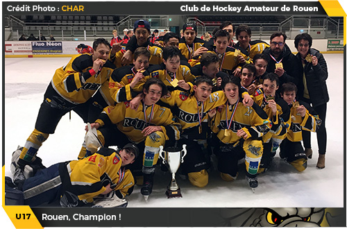 Champions de France U17 Excellence pour la deuxième année consécutive, les Dragons bouclent leur saison en remportant à Toulouse la médaille d'or devant les Bélougas, Mulhouse / Colmar et Chambery / Valence. Félicitations aux joueurs pour cette médaille d'or, à leur entraîneur Christophe Renard pour sa patience et son professionnalisme ainsi qu'à leur encadrement, Nadine Chaumont en premier lieu, pour leur enthousiasme. Une bien belle journée pour le hockey mineur rouennais !