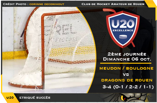 Faciles vainqueurs de leur première sortie à domicile face au Havre (14-2), cette fois pour les Dragons U20 Excellence, bien que s'imposant au forceps 4 buts à 3, l'adversité aura été tout autre face l'association Meudon / Boulogne qui aura donné bien du fil à retordre aux rouennais.