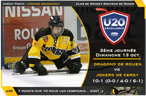 Forts d'un bilan parfait de deux victoires en autant de rencontre (Le Havre 14-2, Boulogne / Meudon 4-3), les Dragons entendaient poursuivre leur série sur leur glaçon même si la première période disputée face aux Jokers incitera à la prudence dans le camp jaune et noir. En effet, alors que les deux portiers respectifs, Jean-Baptiste Renard pour Rouen, Hugo Da Silva pour Cergy rivaliseront d'adresse tout au long du premier tiers pour congeler chacune des tentatives adverses, il faudra patienter jusqu'au début du deuxième tiers pour voir le tableau d'affichage de la patinoire de l'ILe Lacroix s'exciter comme un « gamin le matin de Noël » Jusqu'alors bel et bien résigné à bouder les deux équipes, en l'espace de cinq minutes à l'entame du tiers médian, le tableau des scores s'illuminait par deux fois à la faveur des Dragons. Une première offensive conclue par Konstantin Kebets (22'56), suivie d'une réplique dans la foulée pour Léo Compignie (26'27) et les Dragons menaient désormais 2-0. Dès lors, les affaires seront bien plus aisées pour les jeunes rouennais qui profitaient même de la fin de la période pour ajouter deux buts par l'intermédaire de Konstantin Kebets à nouveau (37'55) et Noah Athuil (39'28) qui mettait fin au passage à l'hégémonie des U17 buteurs.