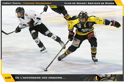 Combattifs dans les bandes, les Dragons dérangeaient ostensiblement leurs voisins amiénois dans leur sortie de zone. Sous pression, la défense d'Amiens avait toutes les peines du monde à s'en sortir sans faire de faux-pas. A tel point que consécutivement à un dégagement interdit sur un geste trop précipité, l'engagement suivant remporté par Antonin Germond en zone défensive amiénoise créait à nouveau le danger au prix d'une haute lutte dans le coin dans lequel était impliqué le défenseur Lucas Villain et son compère Bastien Zago qui en sortait vainqueur avec le deuxième but (27'52) Sans outrageusement dominer la rencontre, les Dragons, pas à pas, sérieux et besogneux, creusaient l'écart au tableau d'affichage alors que de son côté le portier rouennais Gaëtan Richard s'amusait à contrarier chacune des tentatives amiénoises en contre jusqu'à celle de Tom Pagnod-Rossiaux à la mi-match qui plombait l'ambiance chez les rouennais. Nul doute qu'un troisième but rouennais aurait pu être fatal à cette série alors que le retour en grâce amiénois relançait totalement l'intérêt d'une partie qui n'en manquait pas pour autant. Derechef, quatre minutes tard, la parité était de rigueur à nouveau après le passage de Clément Garrido heureux de ramener le score à 2-2 (34'01) et de remettre les pendules à l'heure amiénoise. Totalement déboussolés, les rouennais se laissaient emportés, débordés, chavirés par la vague rouge et noire qui embarquait tout sur son passage y compris le troisième but inscrit par Théophile Prevost (35'18) Qu'elles seront longues les minutes séparant les dragons de la pause tant attendue pour se poser et faire le bilan d'un deuxième tiers bien compliqué.