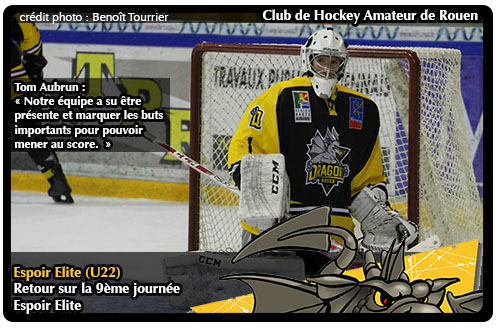 A l'image du portier rouennais, l'international U20, Tom Aubrun, « « Notre équipe a su être présente et marquer les buts importants pour pouvoir mener au score. C'est une victoire qui fait plaisir après la défaite difficile de la semaine dernière. Ramener les trois points était important pour nous, cela nous permet de reprendre de la confiance nécessaire pour aborder la suite. » Après la rencontre jouée à Villard-de-Lans, c'est un sentiment de soulagement qui habitait les rouennais. Rassérénés par l'ouverture du score de Johan Saint-André, les rouennais géreront tranquillement leur rencontre en disposant des Ours 4 buts à 1 (résumé) dans une journée où les quatre premiers du classement s'imposeront face aux quatre suivants, un faux-pas bien fâcheux était à éviter pour les quatre protagonistes du haut du classement avec la palme pour Hockey 74 qui signait le « carton » de la saison avec une victoire 16-2 sur Reims, prochain opposant aux rouennais. Toujours leaders à la différence de but sur Grenoble, les Rouennais enlaceront un nouveau succès en Champagne. Craintifs avant la rencontre comme le soulignait l'ex-rouennais Benoît Valier « Je m'attends à un match très compliqué. Je sais que ça va être dur de s'imposer face à Rouen. » les phénix ne parviendront à poser des problèmes aux rouennais que par quelques fulgurances. (présentation) Artisan de la victoire rouennaise avec 5 points, 2 buts, 3 passes, Dimitri Thillet marquait de son empreinte un match qu'ils domineront de la tête et des épaules. A 6-0 au début du troisième tiers, les deux buts rémois ne troubleront guère la marche en avant des Dragons victorieux 7-2 (résumé) Une affaire sérieuse pour les rouennais qui assisteront non sans plaisir au succès de Hockey 74, en plein dynamique positive depuis trois matchs face à Grenoble 5-4 en match avancé. De fait, libérés un temps de la pression grenobloise au classement, c'est avec une excitation certaines que les rouennais aborderont le tournant de la saison régulière à mi-parcours avec une double confrontation décisive face à Amiens. Deux derbys en une semaine, le dimanche en Picardie, le mercredi en Normandie, difficile de rêver mieux pour les « jaune & noir » Au fil des années, la Fédération Française des Sports de Glace avaient habitué à quelques originalités, c'est donc presque sans surprise que les clubs espoirs aborderont une 11ème journée programmé le même jour qu'une journée de Ligue Magnus. De fait, avec la règle des joueurs formés localement obligeant les clubs senior à intégrer de jeunes français, c'est une journée totalement galvaudée qui se tiendra. Victime de cet inique mépris du championnat Espoir, Amiens sera salement puni pour avoir fait le choix de jouer la carte jeune en Ligue Magnus. Honteux. De la première manche entre Rouen et Amiens, seule la victoire 10-1 jaune et noir importera face à une équipe d'Amiens beaucoup trop jeune et tendre pour contrarier les Normands (résumé) « Après notre défaite de justesse à Amiens 6 buts à 5, nous avions à cœur de rebondir. Même si le niveau des deux équipes n'était pas à leur juste valeur du fait des nombreuses absences, nous avons réussi à prendre le dessus et à nous faire plaisir en équipe avec une bonne partie de notre gardien Tom Aubrun qui nous tient dedans. Nous nous maintenons en tête d'un classement plutôt serré où le moindre faux pas pourrait nous couter cher. Pas le temps pour nous de souffler, nous devons nous tenir prêt pour les prochaines échéances à commencer par ce mercredi à la maison face à Amiens » à l'image du défenseur Théo Lanvers personne n'était dupe du côté rouennais et chacun savait que cette victoire galvaudée sera rapidement oubliée à l'issue du « vrai match » du mercredi sur l'Ile Lacroix. Même son de cloche du coté amiénois avec le capitaine Antoine Buriez également prêt au combat « Nous abordons ce match plutôt confiants d'autant plus que la dernière fois que nous avons joué à effectif « complet », nous sommes parvenus à jouer un très bon match qui s'est soldé sur un score de 6-5 en notre faveur. Depuis tout petit, ces matchs là, on les attend et on se doit de les gagner avec l'envie. Forcement aujourd'hui c'est encore le cas, les deux équipes se donnent à fond et à chaque fois on se retrouve avec des matchs intensifs. » (présentation) De ce choc entre les deux rivaux historiques naîtra l'une des plus truculentes confrontations avec une partie en deux temps, la première largement dominée de jaune et de noir avec un score à l'avantage des Dragons 5-1 à l'entame du deuxième tiers, la deuxième bien plus florissante our les Gothiques qui parviendront à trouver le chemin des filets rouennais à cinq reprises, Rouen arc-bouté sur sa défense parvenant à sauver les meubles au plus fort du tsunami rouge et noir en marquant deux buts pour conclure une épique victoire 7-6 dans le temps réglementaire (résumé). Affaire parfaite au classement pour les Dragons en dépit d'un score inquiétant.
