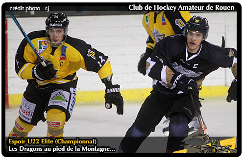 Pour la troisième année consécutive, c'est face à Reims que l'aventure jaune et noire débutait. Pas toujours heureux dans leurs résultats face aux champenois, cette fois, il n'y aura pas débat. Avec un quadruplé de Dimitri Thillet en dix-huit minutes, sur les bords de seine, les Dragons profitaient de cette première journée pour affirmer ses ambitions. Alors que l'attaquant rouennais ajoutera un cinquième but à son compteur personnel, c'est sur le score de 8 buts à 3 que les Dragons s'imposeront au terme d'une belle démonstration offensive. Symboliquement, la première journée offrait un tableau représentatif de la situation du championnat U22 Elite avec un quatuor d'équipe classique, Rouen, Grenoble, Hockey 74 et Amiens s'imposant aisément face au « reste du monde » dans un groupe clairement scindé en deux. Avec quatre matchs de suite à domicile pour débuter, Rouen se devait de prendre des points rapidement pour s'éviter une pression supplémentaires lorsqu'il sera venu le temps de prendre la route. Avec en ligne d'horizon la troisième journée et le premier test de la saison face aux Gothiques d'Amiens, Rouen poursuivait sa mise en route avec une deuxième succès face à Gap 5-2, la troupe picarde justement étant la première équipe du quatuor infernal à céder des points face à Grenoble (3-5) Décidément pressés et pressant, y compris face à Amiens, les Dragons ne connaîtront que peu de tressautements. A l'ouverture du score jaune et noir de Raphaël Faure en infériorité numérique, Anthony Rech et Johan Saint-André répondaient pour permettre à la troupe jaune et noir de mener 3-0 en vingt minutes. Menant au score jusqu'à 4-0 par l'entremise d'Aurélien Dorey, l'escouade haut-normande, en dépit de quelques sursauts d'orgueil adverses mis en évidence par les trois buts rouge et noir, se satisfera d'un 6-3 plutôt efficace. Pour le compte de la 4ème journée, c'est un bus récalcitrant qui empêchera les Brûleurs de Loups de Grenoble de venir défier les Rouennais sur leur Ile. Bloqués un long moment au beau milieu de la campagne icaunaise, les isérois devront se résoudre à faire demi-tour pour rentrer à la maison sans jouer. Si bien entendu le match sera reprogrammé au début du mois de décembre, l'occasion était belle pour Hockey 74 de prendre seul la tête du championnat au bénéfice d'un éventuel succès à Amiens. Etrillés 6 buts à 1, les Hauts-Savoyards seront les grands perdants de cette 4ème journée chaotique (résumé) A défaut de se croiser sur la glace, Grenoble et Rouen poursuivront leur duel à distance à commencer par les Dragons impériaux à domicile face aux Ducs d'Angers. Vainqueurs logiques et sans trembler 5-0 (résumé), les Normands en profitaient pour mettre la pression sur Grenoble contraints de s'imposer face à Hockey 74 pour tenir le rythme jaune et noir. Chose faite 6-2 et un deuxième match perdu de suite pour la Haute-Savoie, peu à peu après cinq journées, l'écart se creusait entre le duo de tête et ses poursuivants.