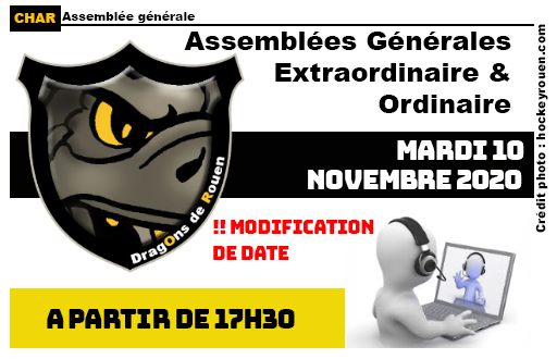 J’ai le plaisir de vous adresser cette nouvelle convocation pour l’assemblée générale extraordinaire et l’Assemblée Générale Ordinaire du Club de Hockey Amateur de Rouen le :