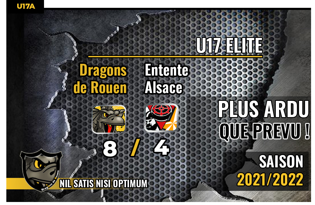 Avant une double confrontation décisive le week-end prochain face à des Grenoblois toujours invaincus avec treize victoires de suite, les U17 rouennais auront « fait le travail » à domicile en s'imposant 8 buts à 4 face à l'entente Alsace au terme d'une partie à l'issue longtemps incertaine jusqu'à l'envolée offensive jaune et noir en fin de rencontre.