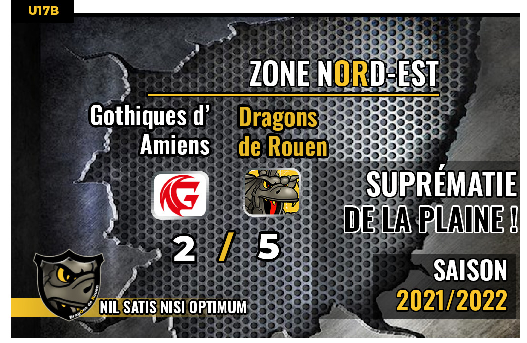 Toujours au sommet du classement de leur poule, face aux troisièmes, les Gothiques d'Amiens, les U17 Excellence rouennais ne pouvaient se permettre de se prendre les patins dans le tapis glacé du Coliseum samarien. Une éventualité que les Dragons chasseront rapidement du revers de la crosse en s'imposant 5 buts à 2 grâce notamment à un triplé de l'attaquant Charles Grandpierre.