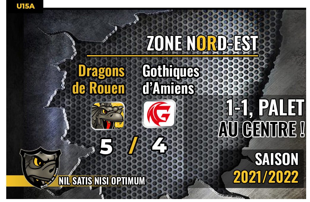 Alors que la semaine dernière, les Dragons avaient du se résoudre à abandonner la victoire à leurs adversaires gothiques, cette fois, de retour sur les bords de Seine, les U15 rouennais auront pris leur revanche en s'imposant 5-4, le but de la victoire surgissant à 7 minutes de la fin de la rencontre.