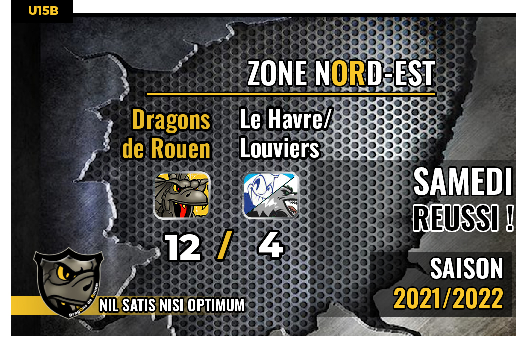 C'est un joli samedi que les Dragons U15B auront passé avec à la clef un probant succès face à l'association Le Havre / Louviers 12-2. Pour autant si à la clôture de la rencontre la victoire jaune et noir sera large, le début de la partie était pour le moins âpre pour les Dragons alors que dans les cinq première minutes de la rencontre Mathis Bouet et Youri Bertin combinaient pour offrir le premier but au Havrais Pacome Allain (05'48) Si la réaction jaune et noir ne tardera pas, Paul Lubin (09'22), Hugo Bernier (12'37) et Elias Cauvin (16'44) se relayant pour porter le score à 3-1 après vingt minutes de jeu, c'est au cours du deuxième tiers que les rouennais parviendront à creuser l'écart et s'assurer vraisemblablement la victoire en ajoutant trois buts dans leur escarcelle.