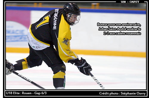 Après une reprise 2011 en douceur à Angers et une victoire 8-1, c'est face à Gap que les Cadets Rouennais devaient disputer leur premier match de la nouvelle année à domicile. Un copieux menu pour les cadets de Nordine Mahdidi au coude à coude au classement face à un adversaire reputé coriace. De fait, les gapençais feront honneur à leur réputation en sortant de la période période en menant au score 2 buts à 1 face à des dragons encore sur la réserve. Pourtant, avant la barrière des dix premières minutes, l'ouverture du score rouennaise avait de quoi donner le sourire. Sur un palet sorti de la zone défensive rouennaise dans le couloir par le couple Alexandre Lubin – Florian Duval, ce dernier s'envolait en direction de la cage montagnarde. Astucieux, l'international faisait flotter le palet devant la crosse du défenseur gapençais sur son repli, à destination d'Alexandre Lubin toujours dans la course. En situation de deux contre zéro avec Johan Saint-André à sa gauche, le numéro 19 jaune et noir prenait un lancer que le portier gapençais ne parvenait qu'à ralentir. A l'affût, Florian Duval parachevait le travail pour le 1-0 (09'22) Un début de match en fanfare pour les joueurs de Nordine Mahdidi qui laissait présager d'une partie réjouissante. Malheureusement pour les jeunes Dragons, ils devaient se résoudre à abandonner sur blessure leur coéquipier Aurélien "Papy"Dorey touché au dos (11'13) Alors que le défenseur rouennais à qui tout le monde souhaite un retour rapide sur le glaçon ne pourra suivre la fin de la rencontre, les Dragons, un soupçon déboussolés, perdaient le fil de leur partie. Même si le duo Duval – Lubin continuait de donner le tournis à Lucas Savoye, le gardien des Alpes (12'30), le score de la première période basculait au moment d'aborder les cinq dernières minutes.