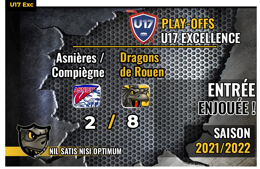 En prenant les points de la victoire face à l'association Asnières / Compiègne 8-2, les Dragons U17 Excellence auront fait un grand pas vers la qualification en finale du championnat de France de la catégorie. Avant de se mesurer ce jour à l'entente de l'est, Besançon / Belfort, les Normands auront passé une agréable fin d'après-midi isarienne.