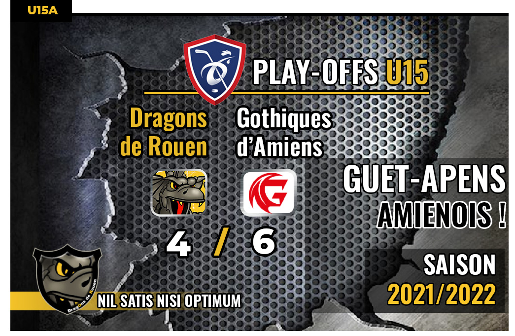 Bien lotis sur les bords de Seine, les Dragons U15, pour leur première rencontre de demi-finale du championnat de France, n'avaient pas la vie facile avec un premier morceau de choix avec une confrontation face aux Gothiques d'Amiens qualifiés directement en demi-finale au bénéfice de leur première place de la poule play-offs noir. Avec l'étiquette de favoris collée sur leurs casques noirs, les Gothiques, dans l'antre glacée de l'éternel rival rouennais, ne semblaient pas être outre mesure sujet à la pression d'un énième derby de la plaine face aux Dragons. Si les premières minutes, un brin poussives, s'apparentaient à un séquence d'observation entre les deux protagonistes, passée la cinquième minute de jeu, la formation rouge et noire prenait la main dans cette rencontre avec l'ouverture du score de Kilian Demain. L'attaquant croisien tout heureux d'avoir décocher la lucarne jaune et noir ne pouvait guère mieux débuter sa partie et ainsi mettre en plein confiance les siens qui parviendront à tenir le score en l'état jusqu'à la fin du premier vingt minutes.