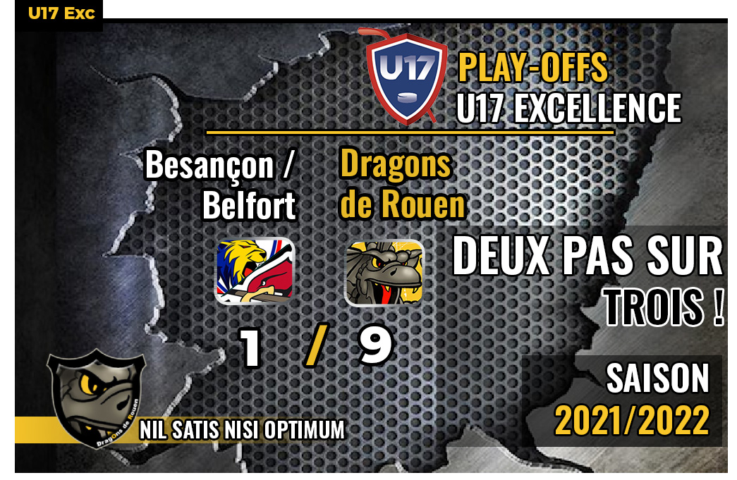 Déjà vainqueurs en finale de zone face à cette même équipe, les rouennais prenaient rapidement l'ascendant dans la rencontre grâce à l'ouverture du score de Nicolas Lechevallier (08'30) Une entrée en matière réussie que les normands sauront capitaliser en doublant la mise peu avant la fin du premier tiers par l'intermédiaire d'Eloi Bouvet-Canivet (16'46) En amassant un sympathique pécule de deux buts en vingt minutes, les rouennais pourront aborder avec sérénité la suite de la partie d'autant plus qu'au bénéfice d'un début de tiers médian tonitruant, ils creusaient l'écart de deux à quatre buts au moment de franchir la frontière de la moitié du match. En effet, alors que Felix Gaultier s'illustrait en apportant le troisième but à son camp dès le début du tiers (22'53), les patins en feu, le jeune Dragon récidivait quelques minutes plus tard pour porter le score à 4-0. Certes, trente secondes plus tard, Raphaël Cretin se montrait pertinent en réduisant le score pour Besançon / Belfort mais indéniablement la mainmise sur cette rencontre était jaune et noir avec le cinquième but normand raflé par Jacob Serre (30'52)
