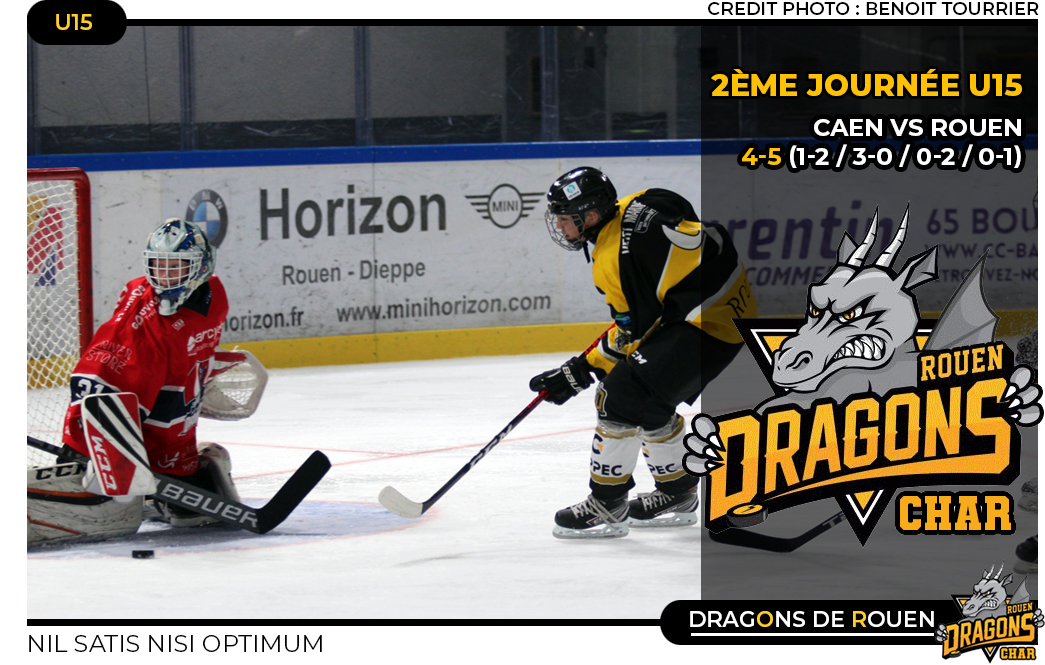 Larges vainqueurs le week-end dernier des Coqs de Courbevoie (22-0) en match d'ouverture, cette fois, les Dragons U15 avaient le droit à un véritable test avec un épineux déplacement chez les voisins de Caen. Et le moins que l'on puisse dire c'est que les rouennais auront fait durer le suspense en allant jusqu'à la prolongation pour s'imposer 5 buts à 4.