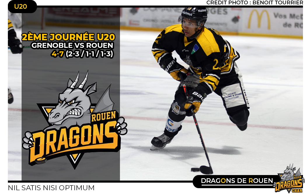 Finalement dans cette rencontre où tout le gratin du championnat U20 Elite était invité, c'est le collectif jaune et noir qui fera merveille et qui fera basculer la rencontre définitivement à la faveur des Dragons. Dans les dix premières minutes du troisième tiers, par deux fois, les rouennais feront mouche. Dans un premier temps, sur un coup de canon du défenseur Hugo Deberge (45'16) puis trois minutes plus tard, sur un bon décalage de Tim Aubry plein centre pour le lancer chirurgical de Johanès Avonde (48'32) A une grosse dizaine de minutes de la fin du match, Rouen menait 6 buts à 3 et ce n'est pas le triplé de l'intenable Hugo Nogaretto qui brisera l'enthousiasme jaune et noir. Précédemment sevré de but sur un lancer de pénalité parfaitement négocié par Mathis Thirion (50'11) rentré peu avant la mi-match, l'attaquant grenoblois prenait, néanmoins, une timide revanche en marquant le quatrième but grenoblois en avantage numérique (52'58) Sûrs de leur force, les normands finiront de jouer leur partition en fanfare avec un septième et dernière but juste avant la barrière des cinq minutes, le dernier mot revenant au duo Tommy Perret – Kaylian Leborgne, le premier servant le second pour un septième et dernier but en infériorité numérique (54'23) Efficaces. Quatre points pour le premier, un triplé pour le second et une jolie victoire collective pour les Dragons.