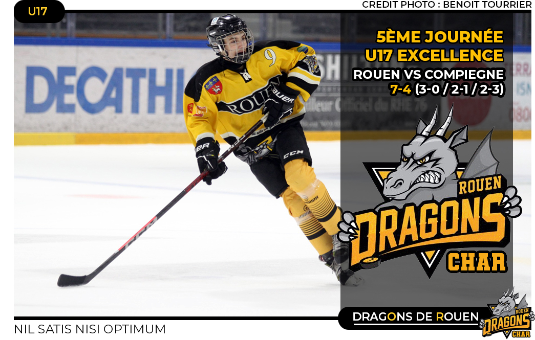 Avec quatre victoires déjà au compteur, en s'imposant 7-4 face à l'entente Compiègne / Valenciennes, les Dragons de l'U17 Excellence rouennais, forts de son quintette de succès, poursuivent leur course en tête de la poule avec trois points d'avance sur son rival amiénois, vaincu dans le même temps à domicile par l'entente Flandres 59 (4-10) Bonne affaire pour les Dragons.