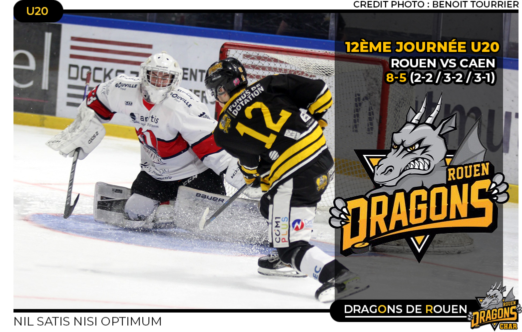 L'un leader de la poule A, Rouen, l'autre de la Poule B, Caen, nul doute que l'opposition entre les deux protagonistes réservait un feu d'artifice aux spectateurs de l'Ile Lacroix alors que dans la première période les uns répondaient aux autres sans coup férir. C'est ainsi que par deux fois les rouennais prendront l'avantage dans la rencontre, l'ouverture du score pour Eliott De Mali (07'21), le deuxième but jaune & noir pour Jordan Hervé (13'36) mais systématiquement le Drakkar Caennais se refusait à chavirer en répondant du tac au tac par Adam Maheut (11'43) et Raphaël Chauvel (15'58) Tenaces, coriaces, les superlatifs peuvent s'enchaîner pour qualifier cette équipe caennaise qui contrariera longuement les plans de victoire des Dragons. Ainsi, en touchant la cible par deux fois par Hugo Deberge (24'18) et Fabian Riu (24'48) en trente secondes, les rouennais escomptaient bien avoir briser le moral de leurs adversaires dès l'entame du deuxième tiers. Hélas pour les Dragons, il n'en était rien, tant mieux pour l'enjeu de cette partie qui voyait un flamboyant retour au score des ex-bas normands par l'intermédiaire de Paul Passivement (28'03) et à nouveau Raphaël Chauvel (36'37)