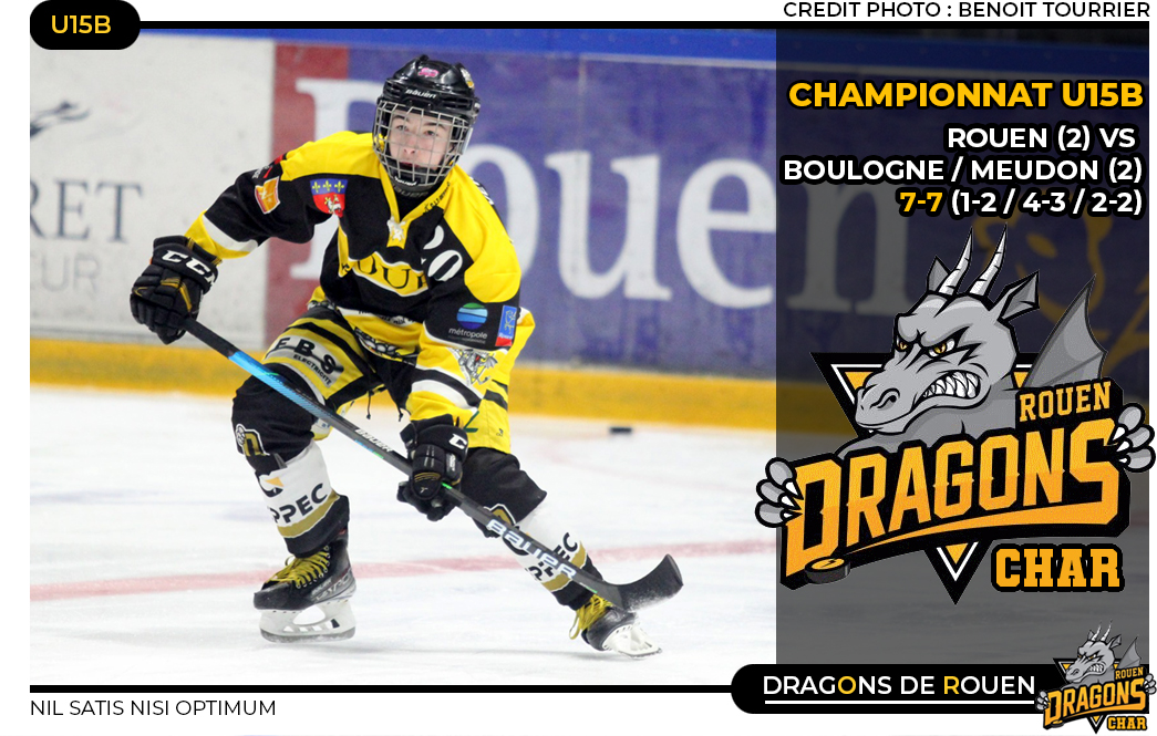 Si l'ouverture du score était bien rouennaise avec élégante tentative réussie d'Enzo Quitteville (06'24), indéniablement jusqu'à quasiment le mi-match, les joueurs de Boulogne / Meudon se tailleront avec voracité la part du lion. Déjà sur l'égalisation de Matthis Poupet (13'01) puis dans la foulée à la frontière entre le premier et le deuxième tiers temps, Théo Michelon clôturant le score du premier vingt (18'36), Lucien Albentosa s'offrant le primo but du tiers médian (21'20) Décidément bien acerbes, les patins parfaitement affûtés, les franciliens se jouaient une quatrième fois de la défense jaune & noir, cette fois par Gabriel Aguiar pour porter le score à 4-1 (26'15) Dur. Dans la tourmente, largement menés au score, les Dragons ne déposeront pas pour autant les crosses sur la glace et feront preuve d'un irréprochable état d'esprit pour revenir au score. Premier guerrier à se positionner face à la cage francilienne, Buddy Coutant (28'53) faisait preuve d'une belle abnégation pour d'une part juguler l'hémorragie offensive parisienne & d'autre part relancer ses coéquipiers qui lui emboitaient le patin aussi sec. Mathis Dura (29'45), Noé Lebunetelle (34'58), Théo Everaert (39'11), les trois larrons se chargeaient de renverser totalement la rencontre, le score basculant à la faveur des Dragons à 5-4, fort heureusement pour l'entente Boulogne / Meudon, Eliott Lia, salvateur, ramenait le score à 5-5 (39'37) à quelques encablures de la deuxième sirène.