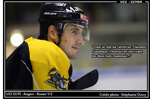 Face à une équipe espoir d'Angers au complet, les Dragons rouennais diminués par l'absence des cadets, de retour des Alpes tôt ce matin et des joueurs évoluant avec l'équipe professionnelle menagés en vue des play-offs de Ligue Magnus, auront effectué une belle opération en s'imposant 2 buts à 1 sur la glace du Haras. Après une première période vierge de but, c'est en avantage numérique que les Rouennais parviendront à toucher la cible par deux fois. Dans le rôle de l'artificier, Clément Gaudeaux s'illustrait en inscrivant les deux buts rouennais sur des services respectifs de Nicolas Lehericey (27'12) et Valentin Dumélié (35'27)
