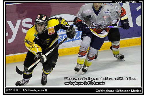 Deuxième volet de la confrontation entre Rouen et Mont Blanc à l'occasion des demi-finales espoirs. Après la séance de la veille qui aura vu l'étriquée victoire 4 buts à 3 des Dragons, une chose est sure c'est une partie tendue qui attendait les deux équipes sur le glaçon de l'Ile Lacroix. Ainsi, dès le début de la rencontre, l'engagement physique était de mise entre les deux équipes.