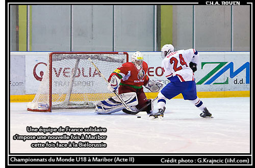 Un bilan loin d'être définitif puisqu'il restait encore aux deux équipes une vingtaine de minutes à disputer. Suffisamment de temps pour permettre aux Biélorusses de revenir au score. Artur Gavrus d'entrée de jeu réduisait la marque (42'31) alors que dans les cinq dernières minutes de la rencontre au gré d'un avantage numérique Andrei Kravchenko offrira l'égalisation à 3-3 pour les tricolores. Après avoir mené de deux buts face à un adversaire mieux coté, les français ne se dégonfleront pas durant la séance de prolongation. En dépit d'un déficit de lancers (42 pour 26), les Bleuets s'accrocheront jusqu'à la séance finale de tirs aux buts. Après la première tentative française celle de Maurin Bouvet qui voyait un arrêt du portier biélorusse, le gardien des bleuets Julian Barrier Heyligen pouvait sourire au moment où le palet passait à droite de sa cage sur la tentative de l'assaillant biélorusse. Nicolas Thos, déjà élu homme du match la veille, gardait les nerfs solides pour sniper le portier adverse pour le 1-0 au contraire du tireur biélorusse suivant qui manquait le cadre à son tour. Une dernière tentative réussie pour les français grâce à Timothé Bozon et les Bleuets remportaient la séance 2-0. Une bien bonne affaire pour la France U18 avant de s'attaquer mercredi à la Slovénie.