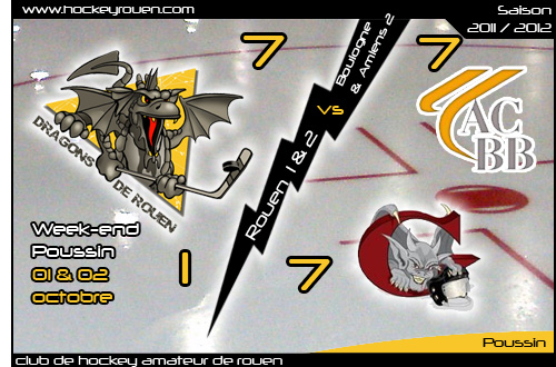Pendant ce temps là, l'équipe de Rouen 1 était confrontée aux parisiens de Boulogne. Déjà titulaires de deux victoires en deux matchs dans le cadre de la Poule Ouest du championnat Ile de France, les Boulonnais auront fait mieux que de la résistance sur la banquise des Dragons. Pourtant brinquebalés 5-0 à la fin de la première période, les franciliens prenaient le taureau par les cornes ou plutôt le Dragon pour inverser la tendance. En inscrivant cinq buts dans la deuxième période tout en ne concédant que deux aux Dragons, l'ACBB revenait au score 7 buts à 5. Sur une dynamique souriante, les parisiens finiront par boucler la rencontre avec deux buts supplémentaires portant le score final de la partie à 7-7.