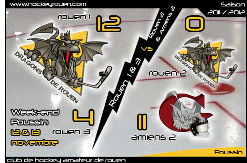 Grosse fin de semaine pour les poussins rouennais sur le pont à l'occasion du week-end du 11 novembre. Que ce soit, Rouen 1, Rouen 2 ou Rouen 3, le trio des équipes poussins jaunes et noirs était sur le glaçon. Sur l'Ile Lacroix pour Rouen 1 et Rouen 2, au Coliséum pour Rouen 3 face à Amiens 2.