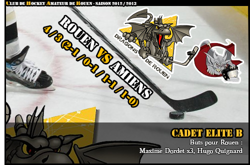 Victoire 4-3 des Dragons rouennais qui contrarient le champion de France en titre Cadet Elite B, équipe qu'ils n'avaient encore jamais vaincu dans le cadre de l'Elite B et qui restaient sur une série de 14 victoires en 15 rencontres.