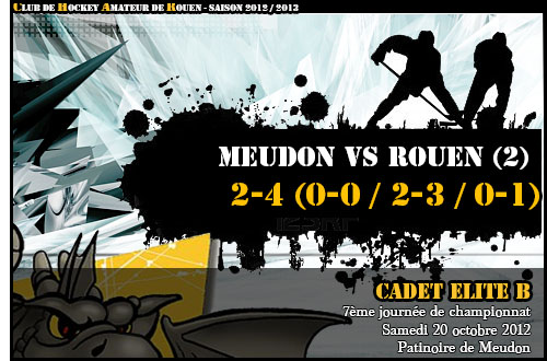 Sur une périlleuse pente depuis trois matchs avec trois défaites concédées successivement face à Strasbourg (1-5), Viry-Châtillon (1-3) et Annecy (2-3), l'élite B rouennaise à l'instar de sa collègue de l'élite A, aura mis un terme à la spirale négative face à Meudon en s'imposant 4 buts à 2 sur la glace parisienne. Une victoire « utile » au classement pour les Dragons qui n'aura pas acquise dans la facilité.