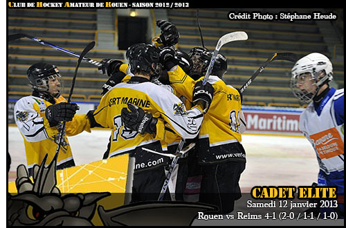 On avait laissé les cadets rouennais se faire la bise pour la nouvelle année au pied du Mont Blanc après leur première victoire en 2013 face à Hockey 74 (lire ici), retour à la maison pour les Dragons cette fois face à Reims, 7ème au classement pour un deuxième passage après le 9-1 subi par les champenois à la fin du mois d'octobre lors de la 7ème journée.