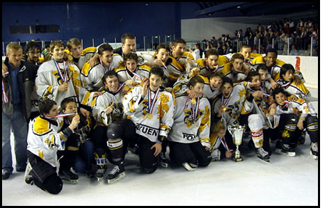 Sans doute se souviendront-ils longtemps de ces quelques moments passés sur le glaçon de Bercy au terme de la finale du championnat de France minime 2005. De longues étreintes, des embrassades à n'en plus finir... des instants de joie tout simplement pour les minimes rouennais qui réalisaient le week-end dernier le rêve de toute une saison en passant autour du cou la médaille de champion de France 2005.... Une médaille d'or pour une équipe en or qui aura passé un week-end parisien mirifique.