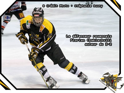 marins lorsque les attaquants balbutient, la défense reste capable de s'exprimer courtoisement offensivement. Ainsi, précieux en avantage numérique, Léo Guillemain ramenait le score à parité (28'02) tandis qu'une poignée de secondes plus tard, Florian Chakiachvili se jouait de Quentin Kello pour le 3-2 (28'46) De retour dans le bon sens de la marche, le train jaune et noir pensait pouvoir arriver à bon quai. Hélas, une erreur d'aiguillage en fin de période fera dérailler une nouvelle fois la douce locomotive normande. En moins d'une minute, les gothiques d'Olivier Duclos mettait à bas les efforts rouennais par l'intermédiaire d'Alexis Besson (37'32) et Maurin Bouvet (37'56) En rentrant au vestiaire à la fin de la deuxième période avec un déficit d'un but (3-4), les Dragons avaient la mine basse. Pour un temps seulement, la révolte grondera dans le troisième tiers.