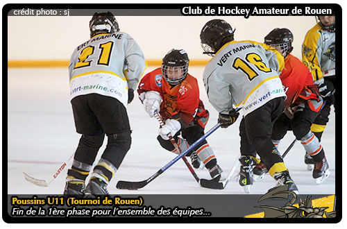 Fin première phase au tournoi U11 de Rouen avec son lot de sourires et de déceptions pour les différentes équipes constituant les deux poules engagées sur la banquise de l'Ile Lacroix. Comme confirmée lors de la première ronde (lire ici), les équipes jaunes et noires auront été à leur aise sur les bords de Seine. Oubliant de profiter du joli soleil printanier effleurant le ciel normand, les Poussins jaunes et noirs auront saigné la glace dans leur poule respective.