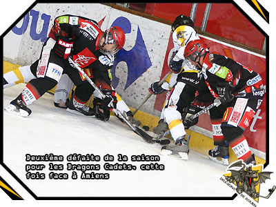 Avec trois équipes échappées à la cime du classement du championnat Cadet Elite, la lutte entre l'infernal trio Amiens, Reims et Rouen s'annonce serrée jusqu'au terme de la saison. Dans les confrontations directes entre les trois larrons, les Dragons, après avoir chuté en début de saison face à Reims aux tirs aux buts, devront s'acquitter d'une deuxième défaite face à un rival direct Amiens en l'occurrence venu s'imposer 7 buts à 4 sur une Ile Lacroix tristounette.
