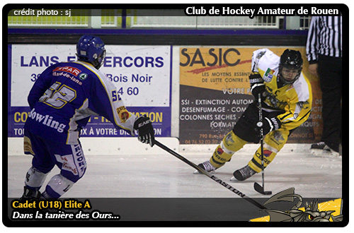 Après Grenoble et Hockey 74, c'est au tour de Villard de Lans de recevoir la visite des Dragons Rouennais à l'occasion du championnat de France Cadet Elite A. Restant sur un succès intéressant la semaine d'avant face à Hockey 74 (victoire 3-0), face à Villard-de-Lans et ses Ours, les rouennais espéraient capitaliser leur premier succès de l'année. Encore fallait-il être en mesure, chez le promu de prendre les points là où les Espoirs, il y a quelques semaines étaient venus s'incliner en prolongation. Méfiance donc pour les joueurs de Nordine Mahdidi qui se faisaient cueillir à froid dès le début du match sur la première opportunité villardienne en avantage numérique par l'intermédiaire d'Eric Aurard qui d'un lancer de la bleue à la trajectoire aléatoire parvenait à tromper le portier jaune et noir Quentin Papillon (1-0 à 00'40) Quarante petites secondes de jeu seulement et les Dragons devaient toujours courir après le score. Peinant à trouver la réplique même si sur quelques éclairs notamment pour Julien Msumbu, Jordan Enselmoz ou encore Joran Reynaud tentaient de sonner la révolte, globalement Rouen, bien que monopolisant la galette, restait sous la pression des attaquants de Villard-de-Lans qui pouvaient s'en donner à cœur joie notamment lors des séquences en supériorités numériques (10'35 & 12'41) Loin d'être sereins, les Rouennais bégaieront leur hockey jusqu'à la première sirène y compris sur l'unique séquence en power play où certes les intentions étaient là mais la réussite ayant décidé de fuir de bien pâles seinomarins.