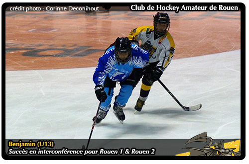 Week-end d'interconférence pour les U13 rouennais avec deux rencontres pour Rouen 1 et Rouen 2 disputées respectivement au Havre et à Asnières. Tradition depuis plusieurs saisons, les interconférences offrent la possibilité à la ligue de Normande de se confronter à la ligue d'Ile-de-France, une bonne occasion pour les uns et les autres de découvrir d'autres horizons que celui du championnat. En théorie seulement puisque pour Rouen 1, c'est une sempiternelle confrontation face au Havre qui animait sa première journée en interconférence. Le Havre, battu en championnat par Rouen 2 à la fin septembre n'aura pas été en mesure de faire trébucher le Dragon jaune et noir. Mis en confiance par un premier tiers soldé sur le score de 4-1 à la faveur des rouennais, le reste de la rencontre se révèlera être une échevelée partie de ping pong au tableau des scores. Au terme des trois périodes en quittant sous le soleil la cité portuaire du Havre, les Benjamins rouennais pouvaient se satisfaire d'un joli succès 10-4 sur la glace de la patinoire de la Porte Océane.